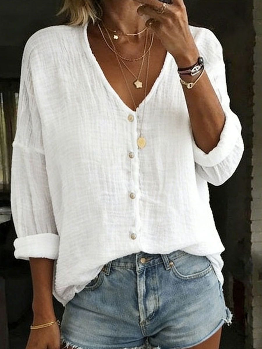 Women's Cotton Linen Loose Solid Color Long-sleeved Shirt