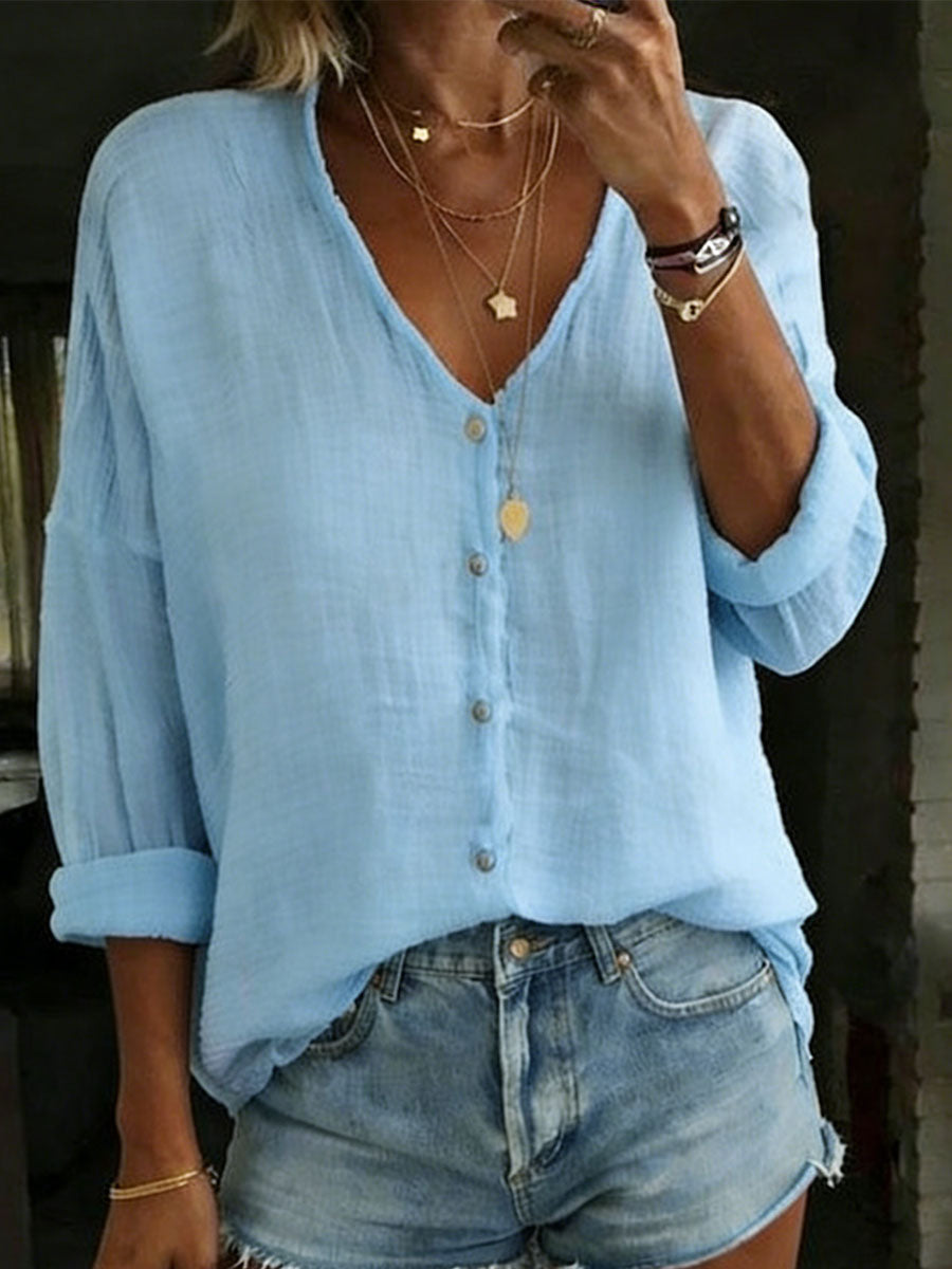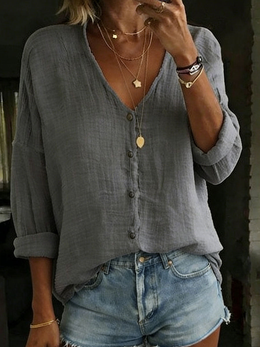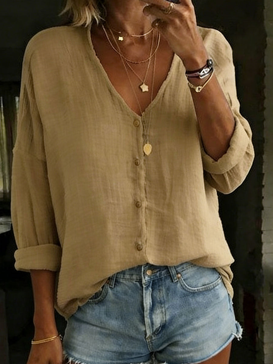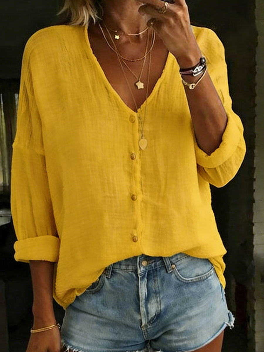 Women's Cotton Linen Loose Solid Color Long-sleeved Shirt